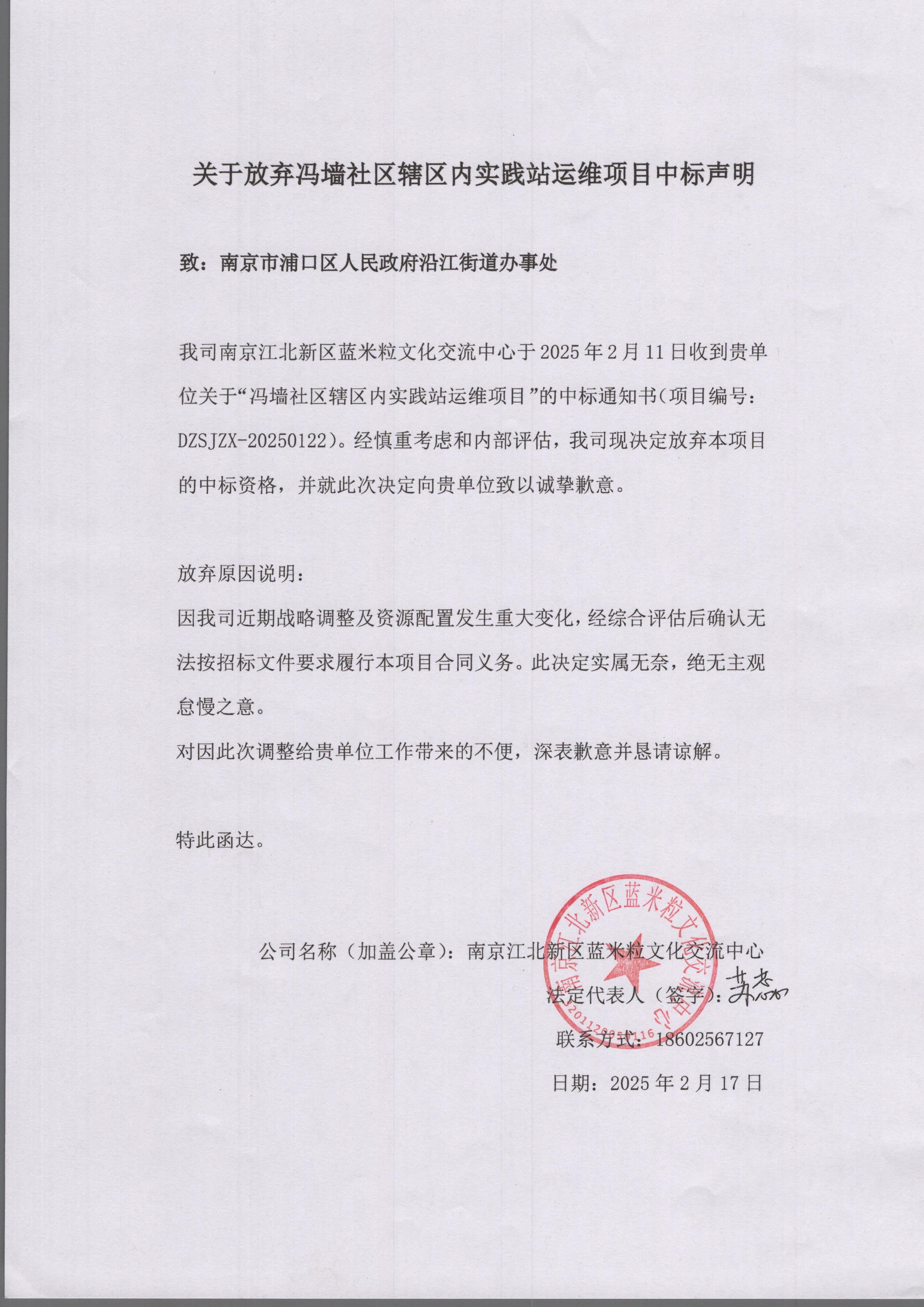 南京江北新区蓝米粒文化交流中心放弃中标声明函